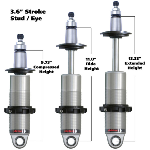 HQ Coil-Over shock with 3.6" stroke and 2" stud mount, universal. Includes 1 rebound adjustable shock, spring mounts, delrin spring washers and bearing spacers (1/2" and 5/8"). 9.7" x 13.3" with a 11.5"-11.75" ride height.