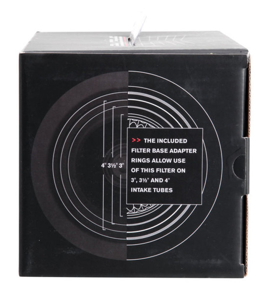 This Spectre High Performance Racing (HPR) Air Filter is a black media clamp-on cone filter that can be used for a wide variety of applications. Using the included adapter rings, this filter can fit 3 inch, 3-1/2 inch, and 4 inch diameter tubes. Manufactured using high quality materials throughout, including oiled synthetic media, urethane, and steel mesh, this washable performance filter is precision engineered for low restriction and better performance. This filter's top houses an inverted cone filter for improved service life and enhanced flow potential. Designed with a triple chrome plated steel top and base, this 9-1/2 inch tall air filter is factory pre-oiled and ready to use.