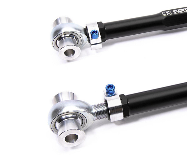 Camaro Rear Upper Arms (RUA) greatly increase the range of rear camber adjustment for high performance track/street applications and are a must for lowered cars to meet alignment requirements. The adjustment range provided by the eccentric washer on the OEM control arm is insufficient to get camber back into proper spec. Our Rear Upper Links feature gun drilled 2024 Aluminum center links, clamps, and clevises, along with Blue Anodized Titanium socket head cap screws and our 360 degree rotating clamp system. This combination provides superior strength, performance, durability, and ease of adjustment. Long gone are the days of fumbling with wrenches to tighten jam nuts while trying to trying to keep your bearings oriented correctly. A simple 3/16" allen key is all that is required to lock down your alignment settings! This kit is combined with our eccentric lockout for the lower camber arm to prevent movement of your rear camber. The lockout has the ability to be set at the maximum, middle, and minimum settings of the OEM camber values, and you can dial in exact camber values for each side of the vehicle using the upper arm. FK Spherical Rod Ends eliminate the soft worn out bushings on the stock links to reduce alignment change in the rear suspension under hard cornering, acceleration and braking. They feature a Teflon liner to provide quiet operation, low friction, smooth articulation, and eliminates bushing deflection under load. The PTFE liner is chemically bonded to the inner diameter of the race. The liner offers a very high load carrying capacity and has greatly increased dynamic wear characteristics. The operating temperatures of the liner ranges from -65º