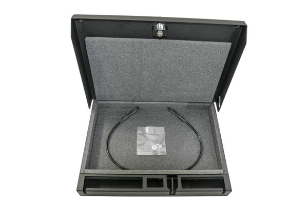 Weighing less than 7 lbs., this lockable welded steel storage box is designed to secure a tablet or firearm and protect valuables while carrying by hand between locations, during travel, inside a vehicle, home or office. Convenient pre-drilled holes allow for easy mounting to solid surfaces including airline cockpits, fleet & service vehicles, home or office environments. Access ports are built in to accommodate power and data transfer cables. Exclusive lid restrictor hinge stop design prevents lid from dropping open when mounted to a solid surface and can be quickly removed to open the lid fully when on the go. The lid restrictor kit allows either 3 inch or 5 inch lid opening, if desired. Keyless entry is provided by Tuffy’s 3 digit combination lock with a two-point steel cam for added security. The included 2 ft. long, 2000 pound test, steel security cable secures the safe to any sturdy mounting surface by attaching to the 1/8 inch steel security cable anchor point. The inside is lined with low-density foam to protect the contents, while compression bumpers keep the lid vibration-free when closed.