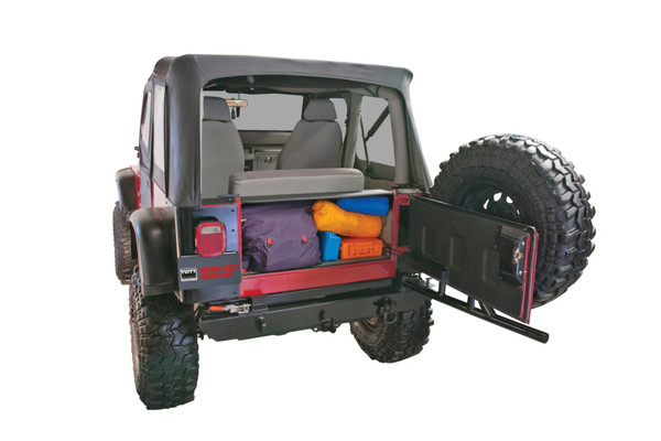 This tailgate security enclosure is a simple, one-piece hinged design that creates a lockable storage area completely protected on all sides. The patented design works in conjunction with the lockable vehicle tailgate and the existing vehicle geometry to secure the area created without the need for a rigid panel connection, any releasable lock mechanisms or other unnecessary hardware. The innovative design eliminates the burden of having to bolt a bunch of panels together. The enclosure maintains the use and function of the rear seat in 2-door models. Quickly and easily installs using standard hand tools with an OEM hardtop or soft top. The assembly easily removes with the use of tools to allow for storage of larger items. On Jeep Wrangler YJ vehicles, the rear tailgate lock must be locked manually with the Jeep key in order for the Tuffy enclosure to function as a secure storage device.