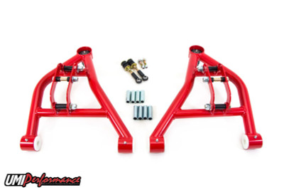 UMI’s Corner Max line of race a-arms are designed from the ground up to be the best performing stock mount a-arm upgrade on the market. The P/N 2655 arms are strong yet lightweight and feature a removable lower mounting system to permit spring changes at the track without separating the ball joints. The ball joint cup is moved forward the proper amount to add up to 4 degrees caster potential and is loaded with high quality Howe standard height ball joints. The double shear coilover mount accepts race industry standard ½” rod end shocks and comes with spacers for all popular models. Also included is a double shear sway bar mount and corresponding end link. The end link fits UMI 4035 and 4067 as well as many other factory fit sway bars.