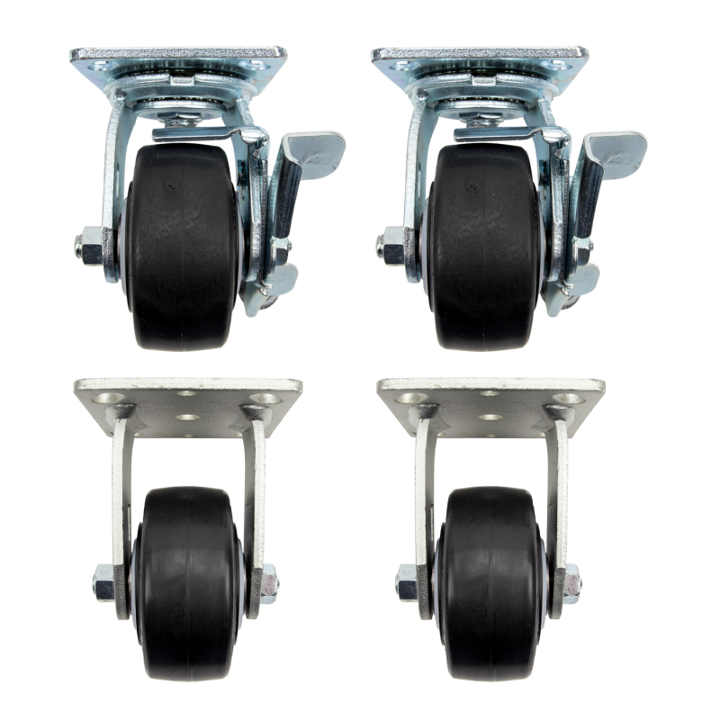 Set of 4 precision ball bearing casters (2 swivel and 2 solid) rated for 400 lb capacity each. For use with WCFab Modular Steel Work Bench Legs. Adds 5.625" height to leg when installed.