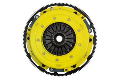 T3R-G06 race, twin disc kit offers twice the number of disc surfaces for better wear, heat capacity and long life compared to single disc kits. These kits use a proprietary Positive Lift Floater System design, which results in quiet operation with no floater rattle and no posts to wear. ACT twin disc kits undergo an exclusive four-stage, heat-treating process on all diaphragms. The ACT twin disc features the ability to adjust for disc wear and provides equal disengagement for discs. ACT's 6-pad rigid race discs are made with high quality, ceramic friction materials. The chrome-moly hub is heat-treated for strength and durability. The lightweight, rigid design allows for quicker shifts and trouble-free service. All ACT twin disc kits include a CNC-machined and dynamically balanced flywheel to ensure trouble-free installation and operation. ACT twin disc kits include a pressure plate, two discs, a floater, flywheel and alignment tool. Some kits may include a pilot bearing and release bearing.