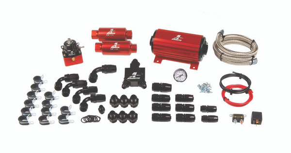 If you?re tired of fuel delivery problems, Aeromotive has the fuel system solution you?ve been looking for. Designed to provide outstanding performance through matched component selection and correct installation, these systems offer the results only years of engineering experience can provide, while eliminating confusion, wasted time and unnecessary expense. This system includes everything needed for a complete Aeromotive system installation in an EFI application. All systems include fuel pump, filters, regulator, port fittings, stainless steel braided hose, hose-ends, wiring and installation hardware.?Does NOT include fuel rails.