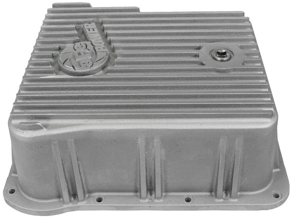 aFe POWER Street Series deep transmission pan brings performance engineering to the protection of your trucks transmission. This transmission pan has additional capacity for 3 to 4 more quarts over stock at the factory line, a magnetic drain plug and a 1/8" NPT port for your temperature sensor. Built-in internal and external fins transfer heat from the fluid to the outside air for maximum cooling. This transmission pan is constructed out of durable die-cast aluminum with reinforced ribs and a wrinkle black powder-coating for maximum strength and styling.