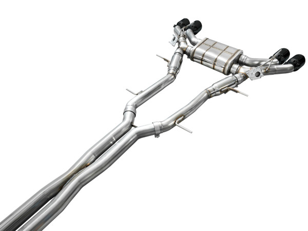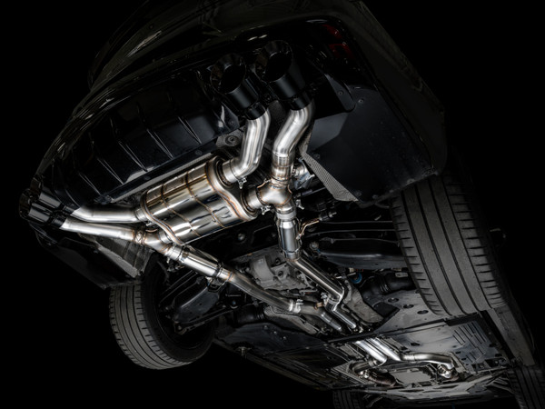 A dual 3" catback configuration constructed of US-sourced T304L stainless steel featuring a bespoke AWE X-pipe to harness the V6TT, patented drone-canceling 180 Technology®, full factory valve functionality, and rigidity where it matters most, all topped with quad double-walled, slash-cut tips in diamond black. This is the do-it-all exhaust for the Cadillace CT4-V Blackwing.