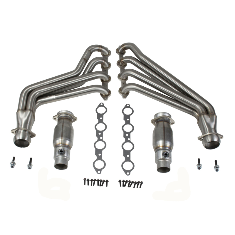 BBK Performance full length long tube exhaust headers offer unsurpassed quality and fitment using top quality materials and American craftsmanship. These long tube exhaust header system are hand built with CNC mandrel bent 304 stainless steel tubing for unrestrictive exhaust flow and maximum performance, 3/8 in. laser cut flanges, patented scavenging collector design and gasket less ball and socket connectors for easy installation. Every exhaust header has been designed specifically for your application to get the most horsepower and torque out of the engine. BBK long tube exhaust headers outperform the competition in quality value and performance. All headers are a direct fit bolt on replacement when used with the correct matching mid-pipes with high flow catalytic converters which are included in this kit. Our decades of exhaust design and experience make BBK Performance your number one choice for late model American car and truck performance exhaust.