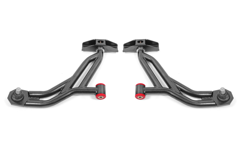 A-arms are one of the most important, yet overlooked suspension components. They are the direct link between the front wheels and the chassis. Any deflection causes a change in alignment, which results in poor performance and driving feel. Fabricated from heavy-duty 1.25-inch, 0.120-inch wall DOM tubing, deflection is eliminated with A-arms from BMR Suspension. BMRs AA754 Lower A-arms are equipped with greasable heavy-duty ball joints, 95-durometer polyurethane bushings (front mount), and greasable Delrin bushings (rear mount) to handle the high loads. Polyurethane bushings add a solid, more responsive feel over the stock rubber bushings. BMRs bushings are internally fluted, which allows grease to evenly coat the inner sleeve. These flutes also direct grease to the outer edge of the bushing, keeping the thrust surface lubricated. This efficient lubrication ensures quiet, reliable operation over the life of the bushings. The combination of poly and Delrin bushings gives you improved steering feel and responsiveness for any type of driving. BMRs AA754 lower A-arms eliminate A-arm deflection, greatly improving steering feel and response in normal and performance driving situations. The polyurethane and Delrin bushings add strength and reduce deflection over the stock rubber bushing, while still absorbing much of the NVH. The means you get a great blend of performance and comfort. Designed for street performance, drag race, and handling, and pro-touring applications, BMR lower A-arms are engineered to give you improved geometry and increased lateral grip during cornering situations. BMR Suspension AA754 Non-Adjustable Lower A-arms are available in black hammertone and red powdercoat for long-lasting good looks. Installation time is 3-4 hours. Proudly made in the U.S.A. Control arm hardware kit RH014 (Includes upper and lower control arm hardware - Highly Recommended) also available.