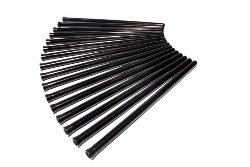 The Pushrod is one of the most important pieces of the valve train, but all too often it's taken for granted. pushrods not only have to be strong enough to not fail, bend or burn up at the ends, they must also match the frequency of all the rest of the pa parts in the valve train, as well as the rpm at which the engine will be run. Today's all-out race engines demand the highest quality components at every step, and COMP Cams Hi-Tech pushrods fill that requirement. Hi-Techâ„¢ pushrods feature a one-piece design from .080" wall, seamless chromemoly tubing that ensures the ultimate in strength and durability. Ends are precision formed, yielding added thickness and strength in the critical tip area, while maintaining constant wall thickness and concentricity. The pushrods are then heat-treated for maximum strength to ensure compatibility with guide plates. They are OD ground for consistency and black-oxide finished with length and part number laser etched on the OD for ease of identification.