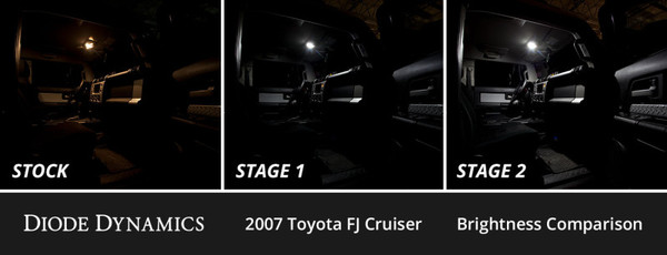 Features Add a modern, cool white appearance. Increased output with LED bulbs. Includes LED replacements for all interior incandescent bulbs. Plug-and-play, simple installation. Overview Increase your light output and add a modern appearance to your vehicle with our Interior LED Conversion Kit compatible with Toyota FJ Cruiser! Factory interior lighting leaves much to be desired with a dated appearance and lackluster performance. By replacing your outdated halogen bulbs with LEDs, you’ll give your vehicle a more modern appearance, and significantly increase the output of your interior lighting. Modern Appearance. The LED bulbs included in this kit feature a 6000K true cool white output without any blue - just like factory installed LEDs. This provides a serious upgrade in the overall appearance of your interior when compared to the factory halogen bulbs. All Diode Dynamics LED bulbs are tested in-house, so you know you’re getting consistent performance. Brightness. This kit is available in two levels of brightness, Stage 1 and Stage 2. Stage 1 gives your interior an ultra-modern appearance, while providing a slight increase in output compared to your factory lighting. Stage 2 steps things up with a significant increase in overall light output throughout the interior. Plug-and-Play. The LED bulbs included in this kit feature plug-and-play connections for simple installation. Our bulbs are not constructed with cheap connectors, so you don’t have to worry about them coming loose and falling out. Simply remove your factory bulbs and these will fit right in place! Two plastic trim removal tools are included to assist with installation. If any bulb does not light up when you turn it on, simply remove the bulb, rotate it 180 degrees and reinstall.