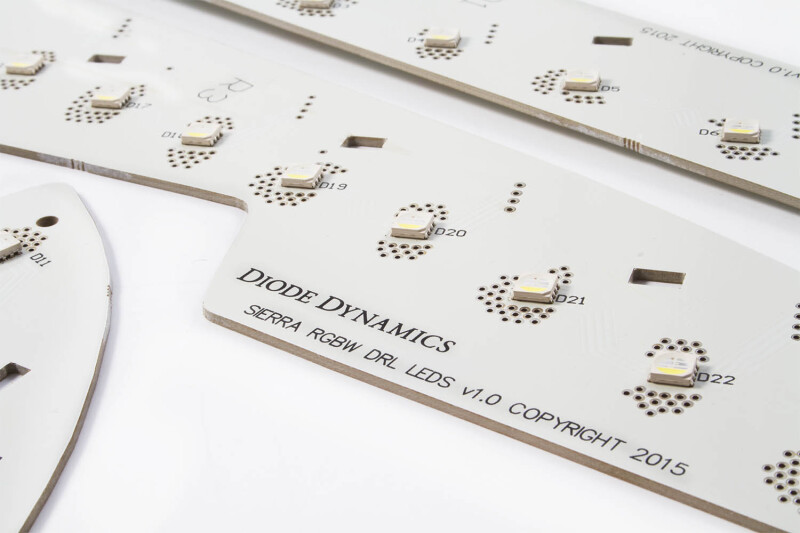FeaturesComputer-designed LED boards compatible with GMC Sierra 2014-2015 headlights.Adds full multicolor functionality plus pure white to factory LED accent.Direct replacement for factory LED boards.Assembled in USA.OverviewFull RGBW. Full multicolor with no sacrifice. Convert the white LED accents inside your Sierra's headlights to illuminate in any color for a unique custom look. Unlike other RGB products on the market that produce a mixed white color our LED boards are RGBW with independent White LEDs. After you have fun with colors just select True White for a crisp clean white output for everyday use.App control. You can choose any color under the sun with the included Bluetooth RGBW Controller including True White. There's preset patterns too including strobe fade and more. But it's the extras that really make this controller special. Simple features like Preset Colors make it easy to use and fun features like Camera Match and Music Sync make it fun to show off! Don't see a pattern you like? Just program your own and save it for later! This controller is the most fully-featured in terms of control and features on the market.Perfect fitment. No need to align and fasten LEDs by hand - this is an OEM-grade solution with exact fitment and perfect alignment of the new LEDs. Just remove the factory boards and ours fit directly in place!Whats Included:Two (2) sets LED boards left and rightOne (1) RGBW Bluetooth ControllerTwo (2) waterproof driversOne (1) RGBW Extension wire