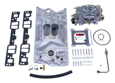 The Edelbrock #2007 Single-Quad Manifold and carb kit is designed for Small-Block Chevy with Vortec or Edelbrock E-Tec Cylinder head applications. With a Manifold and Carb Kit, it's easy to upgrade your induction system with the best combination of Edelbrock proven performance and looks in a single box. These kits include: an Edelbrock manifold, Performer or Thunder Series AVS carb, chrome fuel inlet, intake gasket set, intake bolt set and carb stud kit. The manifold and carbs are available with a standard satin finish or with our bright EnduraShine chrome-like finish for long lasting show quality looks.