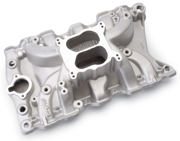 Edelbrock part #7111 Performer RPM Oldsmobile 350 intake manifold is designed for 330-350-403 c.i.d. Oldsmobile's and 1980-1/2 to 1985 307 c.i.d. engines with 5A heads (casting #3317). This Oldsmobile manifold is a high-rise, dual-plane design with 180-degree firing order engineered for maximum top-end horsepower while maintaining throttle response. Port flange has extra material above the runner for use with cast iron 455 heads and Edelbrock Performer RPM heads #60519. Has clearance for HEI distributor. Carb pad accepts square-bore carbs without adapters.