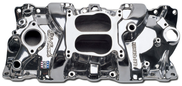 Edelbrock part #21011 Performer intake manifold is designed for street 1955-86 small-block Chevys. Edelbrock's Patented Dual-plane, low-rise design with a 180-degree firing order greatly improves torque over a wide rpm range for excellent throttle response from off-idle through 5500rpm. Not for 1987 and later cast iron or Chevy Bowtie heads. Will fit 1987 and later stock aluminum heads. This manifold offers a polished finish for a brilliant shine and classic look.
