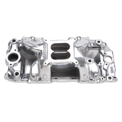 Edelbrock part #75011 RPM Air-Gap RPM intake manifold is designed for 1955-86 262-400 c.i.d. Chevrolet V8's. The award-winning RPM Air-Gap intake manifold incorporates the same race-winning technology that's used on our Victor Series competition intakes. The air-gap design features an open air space that separates the runners from the hot engine oil resulting in a cooler, denser charge for more power. Edelbrock's Performer RPM gives you the ultimate in street high-performance. Accepts all 1976 and later alternator and A/C brackets for the street. No provision for exhaust- heated chokes and no exhaust crossover. Not for 1987 and later cast iron heads and will not fit under stock Corvette hood. This manifold offers a polished finish for a brilliant shine and classic look.