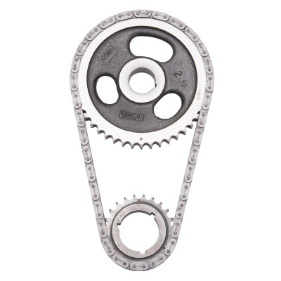 Edelbrock Part #7800 Performer-Link timing chain is for use with Edelbrock or stock cams. They have a solid-bushing chain for a true bearing surface that rolls with the sprockets, eliminating chain stretch. Cam sprockets are made from 35,000 psi tensile strength cast iron. Crank sprockets are made from billet SAE-1144 steel and induction heat treated. Four Performer-Link sets are stock replacement parts and 50-state legal (see listings in bold type). All other sets have three keyway setting points to ensure accurate timing selection for early or late-model vehicles. Performer-Link timing sets are not for use above 6500 rpm- ? Performer roller chain sets are engineered to operate up to 6500 rpm.- ? Never hammer directly on chain or sprockets. You can crack the hardened links and pins and cause early failures. - ? Use a sleeve for installations that require hammering, a brass drift punch may be used if you carefully alternate blows on either side of the sprocket to avoid cocking. - ? Never stretch the chain with a screwdriver. - ? Check for clearance between the timing chain and block and between the chain and front cover before reassembly. - ? Be sure that both cam and crank sprockets are exactly in line with each other. Misalignment can cause chain to break