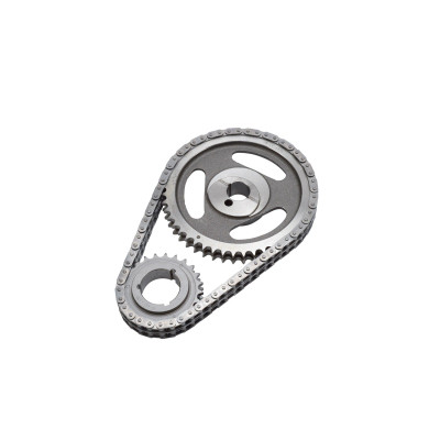 Edelbrock part #7830 Performer-Link timing chain #7830 is for use with Edelbrock or stock cams. They have a solid-bushing chain for a true bearing surface that rolls with the sprockets, eliminating chain stretch. Cam sprockets are made from 35,000 psi tensile strength cast iron. Crank sprockets are made from billet SAE-1144 steel and induction heat treated. Four Performer-Link sets are stock replacement parts and 50-state legal (see listings in bold type). All other sets have three keyway setting points to ensure accurate timing selection for early or late-model vehicles. Performer-Link timing sets are not for use above 6500 rpm- ? Performer roller chain sets are engineered to operate up to 6500 rpm.- ? Never hammer directly on chain or sprockets. You can crack the hardened links and pins and cause early failures. - ? Use a sleeve for installations that require hammering, a brass drift punch may be used if you carefully alternate blows on either side of the sprocket to avoid cocking. - ? Never stretch the chain with a screwdriver. - ? Check for clearance between the timing chain and block and between the chain and front cover before reassembly. - ? Be sure that both cam and crank sprockets are exactly in line with each other. Misalignment can cause chain to break