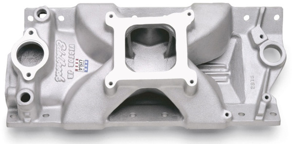 Edelbrock part #2975 Victor Jr. intake manifold is excellent for many applications from drag to circle track racing. This intake manifold provides maximum performance for engines with standard port location, iron and aluminum cylinder heads. The low-profile of the #2975 works well in applications with minimal hood clearance and where 1" or 2" spacers can be used for performance tuning. When carb spacers are not allowed, the #2999 should be used. The Edelbrock Victor Jr. #2975 is a single-plane, high-rise intake designed for maximum race-winning power at higher engine speeds.