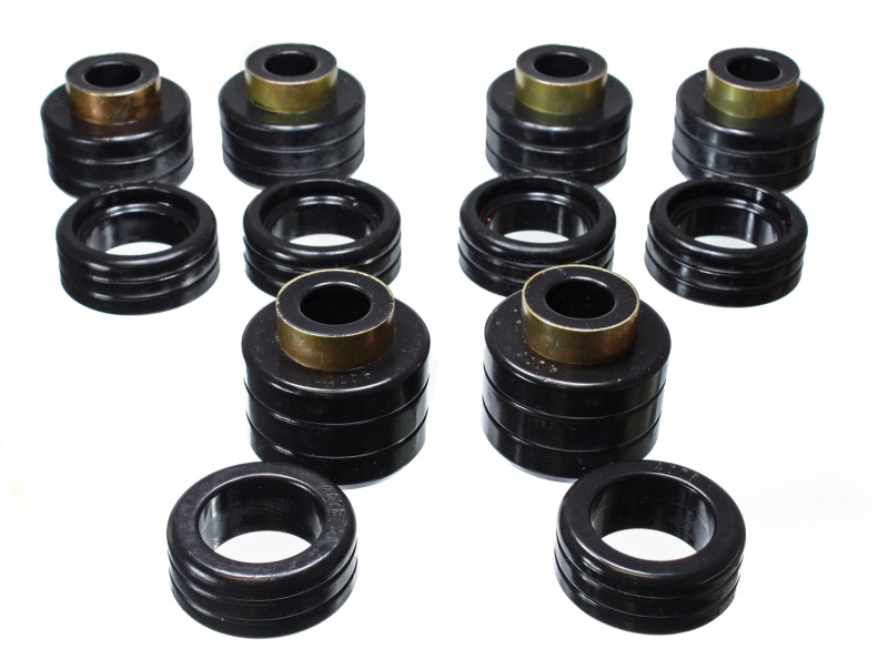 Will replace distorted and worn-out original rubber mounts to maintain car body and truck cab to bed alignment. Original rubber mounts are so soft they often crack, distort, and crush so badly they often fall off. And aluminum body mounts are too harsh for street use that they tend to break and cause other components to break. Energy's specially formulated Hyper-Flex(TM) polyurethane cab and body mounts combine the best qualities of both: they're soft enough for a smooth ride, yet rugged enough for the most demanding road or track. Most sets have a strong zinc plated steel ring molded into them - for added durability and when the application requires it.