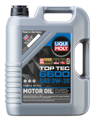 Quick view LIQUI MOLY LIQUI MOLY 5L Top Tec 6600 Motor Oil SAE 0W20 - 22046 Compare $227.99 Fully synthetic superior low friction motor oil. The low viscosity ensures excellent cold start behavior, improves engine efficiency and reduces fuel consumption. The innovative additive technology ensures excellent protection against wear, superb engine... Add to Cart Add to Cart