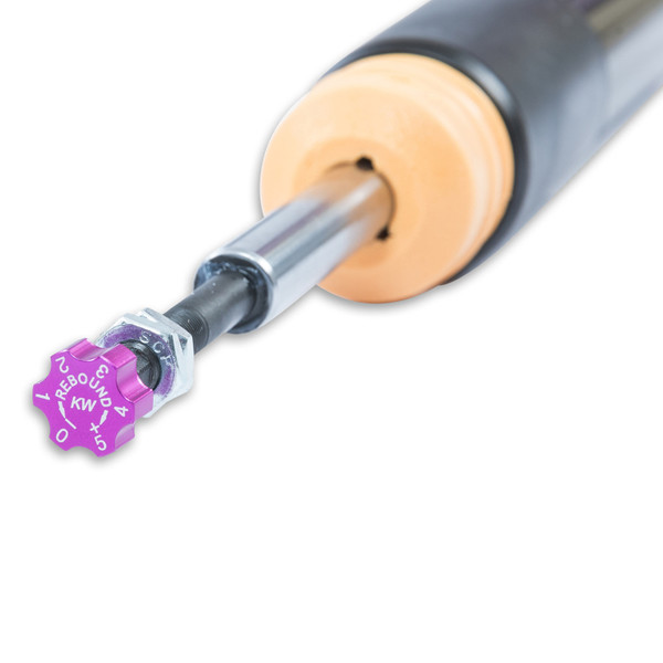 KW V2 INOX-LINE coilovers are the perfect solution for drivers who want more than just outstanding looks and adjustable ride height. In addition to stainless steel coilover struts, and corrosion-resistant components built for long term durability, KW V2 coilovers utilize TVR-A (Twin Valve Rebound - Adjustable) technology that allow Adjustment of the rebound damping characteristics with 16 clicks so you can fine tune the ride comfort or performance to your satisfaction. As with all KW coilovers our engineers develop vehicle specific damper settings that undergo comprehensive testing on the Nurburgring Nordschleife and in our KW 7-post Driving Dynamic Test Center. With a KW coilover kit the driving experience is more dynamic and direct. With the rebound adjustability you have a more direct influence on the handling or comfort of the car. With 16 precise clicks you can adjust the KW dampers (more firm or more comfortable) without affecting the compression damping fine-tuned by our engineers. The two-stage, patented TVR-A (Twin Valve Rebound - Adjustable) technology enables a small volume of oil flow through an adjustable, conically shaped, low-speed bypass during low damper speeds, while at high damper speeds, the main rebound stage valve opens allowing a larger volume of oil to flow. This provides a big improvement in terms of ride comfort without influencing the high-speed range. There are 16 precise clicks availabl e for individual settings, so you can choose between more comfort or more body control. With KW V2 coilovers you can achieve maximum lowering within an approved lowering range that ensures a proper functioning suspension and adequate travel after your car is lowered. Even after years of use you can easily adjust the ride height thanks to the dirt resistant trapezoid thread and composite adjustment collar.