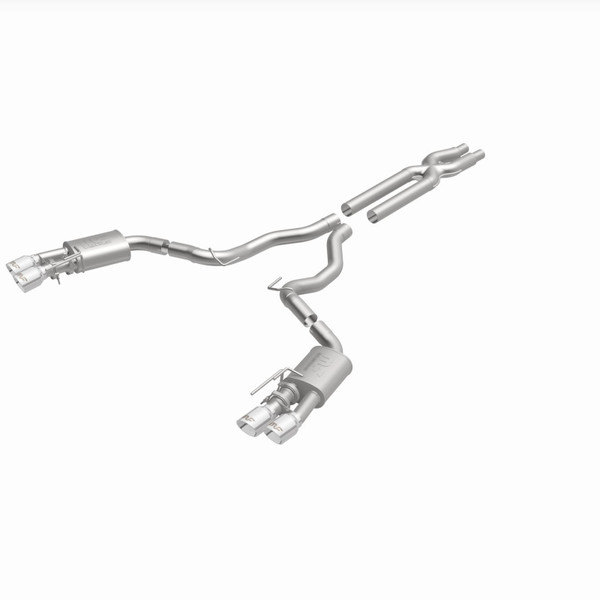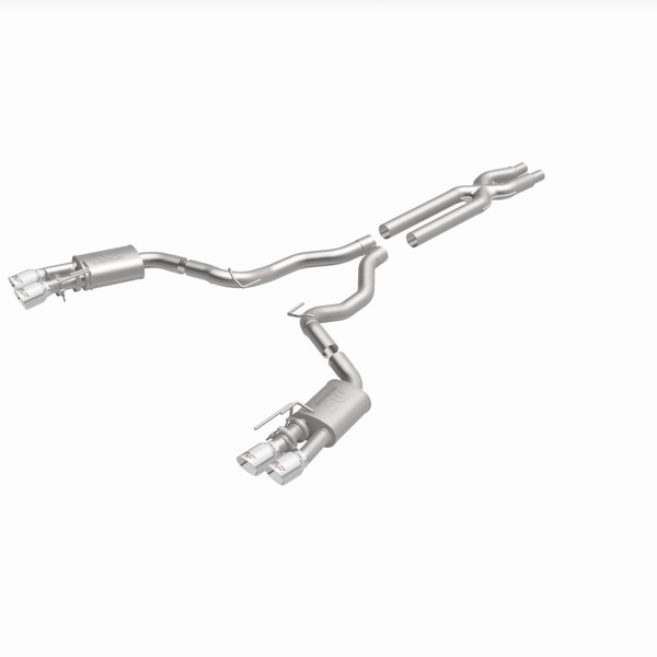The MagnaFlow 2018-2023 Ford Mustang Competition Series Cat-Back Performance Exhaust System 19368 brings an aggressive, attention-grabbing edge to the deep resonant exhaust note we're so well known for. This exhaust kit is designed to enhance your 5.0L 2018-2023 Ford Mustang with dyno-proven performance made possible thanks to fast-flowing mandrel bent 3in. main piping and 2 Straight-Through mufflers ending in a Quad Split Rear exit with 4in. Polished Welded-On Double Wall Angle Cut Folded Edge tips featuring a sporty finish. The exhaust system's cat-back layout replaces your ride's exhaust system from near the catalytic converter on back. Exhaust system 19368 is engineered to make your vehicle's engine produce Aggressive exterior and Moderate interior sound levels, befitting its competition-oriented design. 19368's direct-fit design makes installation a breeze thanks to the use of advanced 3D scanning techniques. This performance exhaust system is made of 100% durable and corrosion-resistant stainless steel and produced using CNC precision robotic manufacturing, all backed by MagnaFlow's limited lifetime warranty. Please check to ensure compliance with local noise regulations.