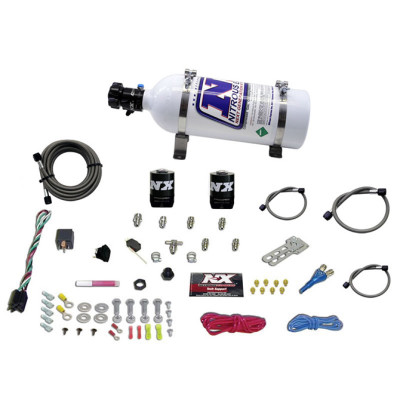 NX dual nozzle nitrous systems are a great choice for vehicles with dual throttle bodies. The dual 'Shark' nozzles give adjustability of 35, 50 & 75 wheel horsepower. System comes complete with 5lb nitrous bottle, stainless bottle bracket, Lightning solenoids, extra long stainless braided N2O line, and all necessary hardware to complete the installation Certificate of Origin Warranty Installation Instructions
