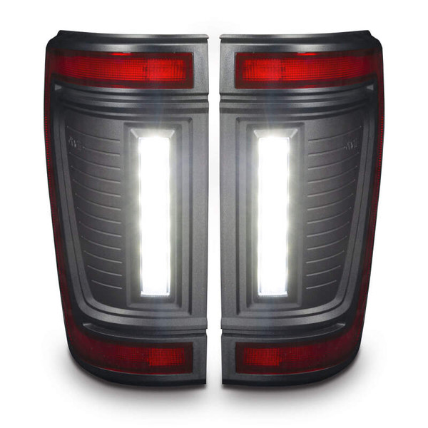Protruding out significantly less than the factory tail lights, this low-profile design has a more streamlined appearance while also reducing the risk of tail light damage. These flush tail lights feature a unique modular design and functional LED lighting elements including high-powered reverse lights, unique signature perimeter lighting, and an animated turn signal sequence. No more problems backing up at night and no longer do you need to install additional reversing lamps onto the back of your truck to get the brightness you desire. That's because these LED reverse lights are basically a pair of LED light bars mounted into the tail light which will provide over 4,400 Lumens of rear-facing illumination! In addition to the attractive ?signature style LED lighting band and the high-output reverse light this design also features a ?dynamic turn signal effect. This ?motion or ?sequential effect is a fluid LED motion from the inside portion of the light to the outside portion of the light signifying the direction of the turn signal with a fluid animated LED sequence. These lights include wiring adapters which make them compatible with all F-150 models from 2021-2024 with or without the factory LED Option (halogen lights) and with or without the factory BLIS cross-traffic sensors. The adapters provide a true plug-and-play option without any other wiring being needed for installation. The factory cross-traffic sensors can be easily swapped over into these new lights with the original factory hardware and using our plug-and-play connectors. The new modular design allows the light to be quickly disassembled for custom painting. The Reverse Light module and Stop/Tail/Turn module can be easily removed from the black housing which can then be painted to match the body color of the vehicle to provide a more customized appearance that more seamlessly blends with the truck.