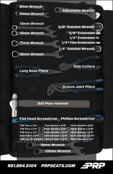 PRP's Can-Am Roll-Up Tool Kit provides everything you need to fix your Can-Am Maverick X3, Sport, or Commander UTV out on the trail. This 35 piece kit includes a selection of high-quality ratchets, sockets, wrenches, extension bars, pliers, and a ball peen hammer (for when things get really fun). We've hand picked the tools that are needed most when working on a Can-Am - So you have only the essentials that you really need. Below we have listed all the tools included, along with a handy guide to the most common uses for each tool. Each tool also includes a Limited Lifetime Warranty. The Roll-Up Bag makes it easy to keep everything neat and organized. It features dedicated sleeves for all the tools included in the kit, as well as a zippered pocket to hold the sockets and any other tools you want to bring with you. The bag is made from extremely durable twill material. It features heavy duty buckles, and an easy to carry grab handle. It can be mounted, or stored securely inside the vehicle. The roll-up style bag makes it quick and easy to grab out of the vehicle when you need it, and the tools inside don't make noise when bouncing around the trails. Don't get caught out on the trail unprepared. PRP's Roll-Up Tool Kit has everything you need to get your Can-Am UTV going! Testimonial "This tool burrito is the product I end up using the most, and has pretty much everything you really need to work on a Can-Am. I know that, because I've broken almost everything on a Can-Am X3." - Aaron Vehicle Fitment Can-Am Maverick X3, Can-Am Maverick X3 Max, Can-Am Maverick Sport, Can-Am Maverick Trail, Can-Am Commander Kit Includes 1- Flat Head Screwdriver – Interior Panels, Hose Clamps, Shock Adjust 1- Phillips Head Screwdriver – Hose Clamps 1- Groove Joint Pliers 1- Side Cutting Pliers - Snip Snip 1- Long Nose Pliers – For when you drop things down where it’s hard to reach 1- 8” Adjustable Wrench 1- Ball Peen Hammer – If something doesn’t fit… make it fit 1- 1/4” Ratchet 1 -