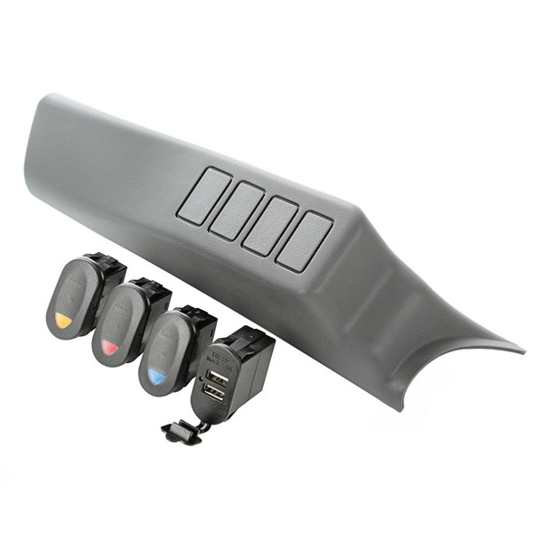 This 4 switch A-Pillar pod kit from Rugged Ridge includes an A-Pillar pod ( number17235.56), 3 marine style 2-position rocker switches (1 each, red, amber/blue), and a combo rocker switch USB connector ( number17235.05). Our A-Pillar Pod has the textured molded finish just like the factory plastic pillar cover it replaces. It snaps into place for a factory look.