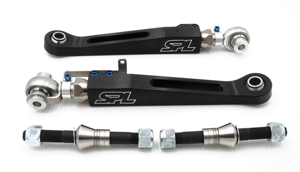 BMW G8X Front Lower Control Arms (FLCA) provide roll center, camber, and track width adjustment for the G8X BMW M3/M4, and allow for full articulation with the proper ball joint angle. The main arm is slotted to allow the use of pinch bolts, and our rotating clamps on SPL Parts' exclusive Double Adjuster lock down camber and track width settings. No more jam nuts!! Long gone are the days of fumbling with multiple wrenches to tighten jam nuts in place while trying to keep your bearings oriented correctly. The lower control arms come with a ride height sensor bracket to maintain factory ride height sensor location, regardless of length of the arm to keep those finicky BMW chassis electronics happy. Our Double Adjuster is machined from 4130 Chromoly