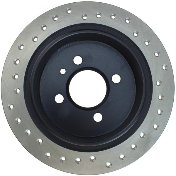 StopTech Drilled Sport Rotors are 1-piece direct replacement brake discs for factory brake systems and stock calipers that look great behind your wheels – and offer significantly improved braking performance. The unique cross-drilling aids with heat and brake dust dispersal; prevents glazing of the pads; adds bite and improves wet and dry braking performance. Built to last; the black e-coating provides protection from corrosion and the high carbon metallurgy (in most applications) offers quieter operation; better crack resistance and increased performance.
