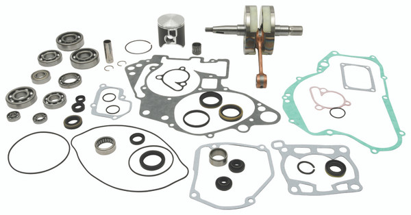 The only complete engine rebuild kit available. Kit includes Hot Rods heavy-duty crankshaft, Hot Rods counter balancer bearing kit (where applicable), Hot Rods main bearing and shaft seal kit, transmission bearing kit, and water pump rebuild kit, Vertex replica piston kit, Vertex complete gasket and oil seal kit, Hot Rods wrist pin bearing, or Hot Cams cam chain (where applicable)