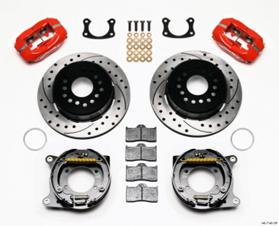 This group of FDL Pro-Series rear disc kits provides a complete solution for popular muscle car rear axles that require a parking brake. Forged billet Dynalite four piston calipers, 12.19” one-piece drum/rotors, and high friction pads provide optimized and balanced braking for all types of custom performance street/strip and show machines. The neatly hidden internal shoe system provides a clean installation with superior static holding power for parking. Optional caliper finishes and rotor designs enable the builder to personalize the style and optimize brake performance for every individual application.